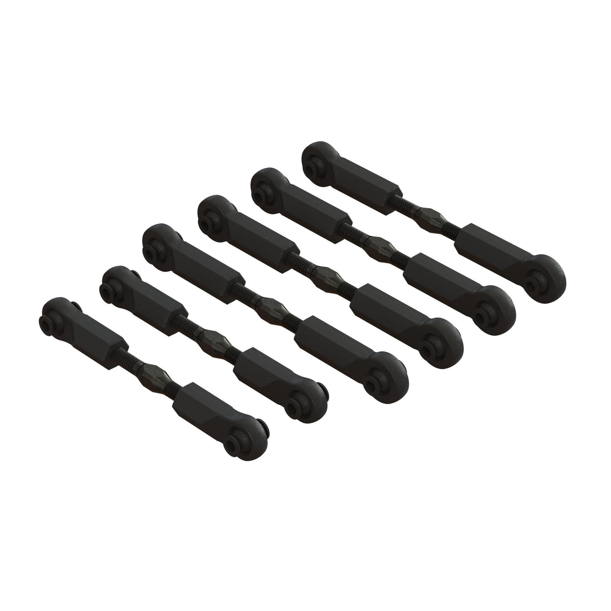 This Assembled Turnbuckle Set is compatible with the Arrma 1/8 Typhon 4WD MEGA 550 Brushed Buggy (ARA4206V3), 1/8 Typhon 4WD V3 3S BLX Buggy (ARA4306V3) and the 1/10 Big Rock 4X4 V3 3S BLX Monster Truck (ARA4312V3).