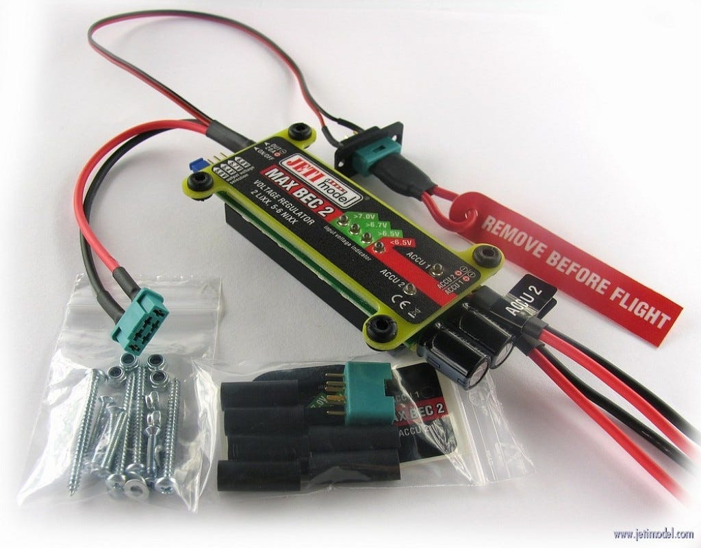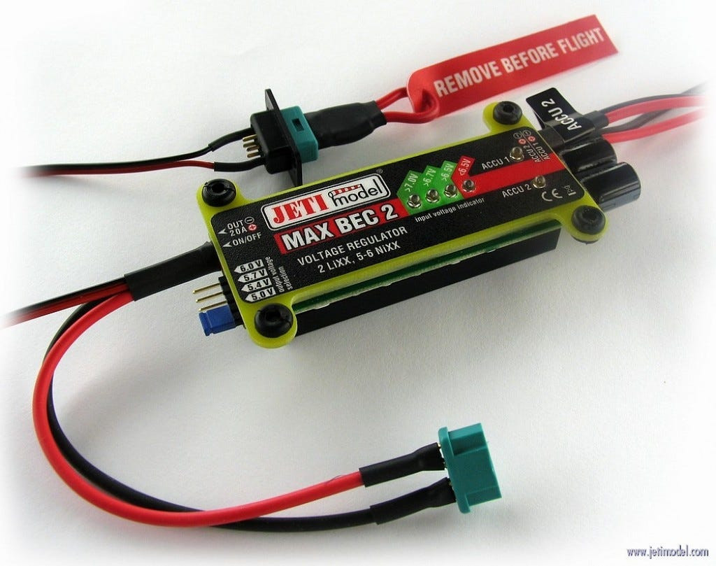 MAX BEC 2 is designed to power the receiver and servos in the model. MAX BEC 2 is a linear voltage stabilizer with an adjustable output voltage. The output voltage is set using a jumper and in one of four positions: 5.0V, 5.4V, 5.7V or 6.0V. MAX BEC 2 can be powered using NiXX and Li–XX cells. MAX BEC also gives an indication of the used capacity of the battery with four LED´s.