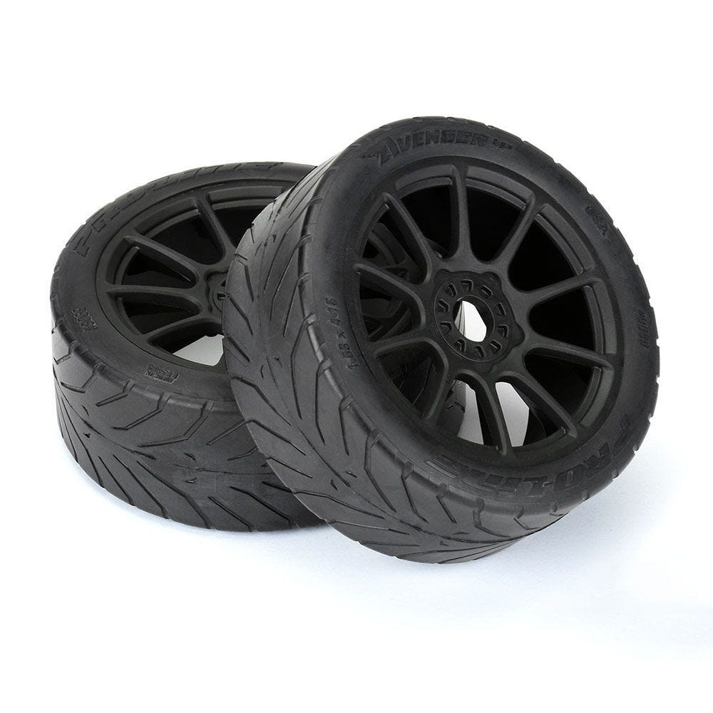 This is a pair of Avenger HP 1:8 Buggy Belted Street Tires. Pro-Line is proud to introduce the History-making Avenger HP BELTED 1:8 Buggy street tires! Pro-Line has developed the technology to mold a High-Performance herringbone weave pattern Belt inside of the all-new Avenger HP. These belted street tires were specifically made for 1:8 Buggies that love to go fast and will not balloon or expand during use. These belted tires will help you go straight and put the power down!