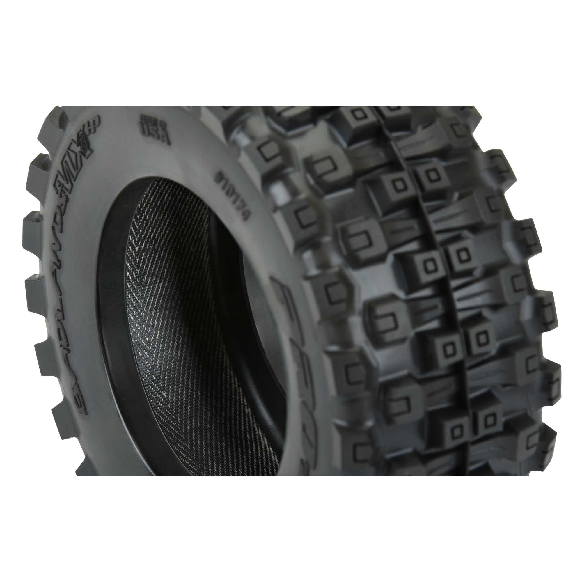 1/10 Badlands MX28 BELTED F/R 2.8" MT Tres MouPro-Line is taking the 2.8" tire game to the next level with the Baddest tire ever conceived: the Badlands MX28 HP BELTED tires! Pro-Line Badlands tires are known for having a sweet Motocross inspired tread and the all-new Badlands MX28 HP tires kick that up a notch with Bigger and Bolder knobby tread in a similar size to the Original Badlands 2.8" tire (PRO117310) that you know and love. The Badlands MX28 is a true All-Terrain tire that will find traction on any surface but is best suited for loose & loamy dirt, mud or grass. Just imagine your truck throwing up huge rooster tails with these awesome looking tires!nted 12mm Blk Raid (2)